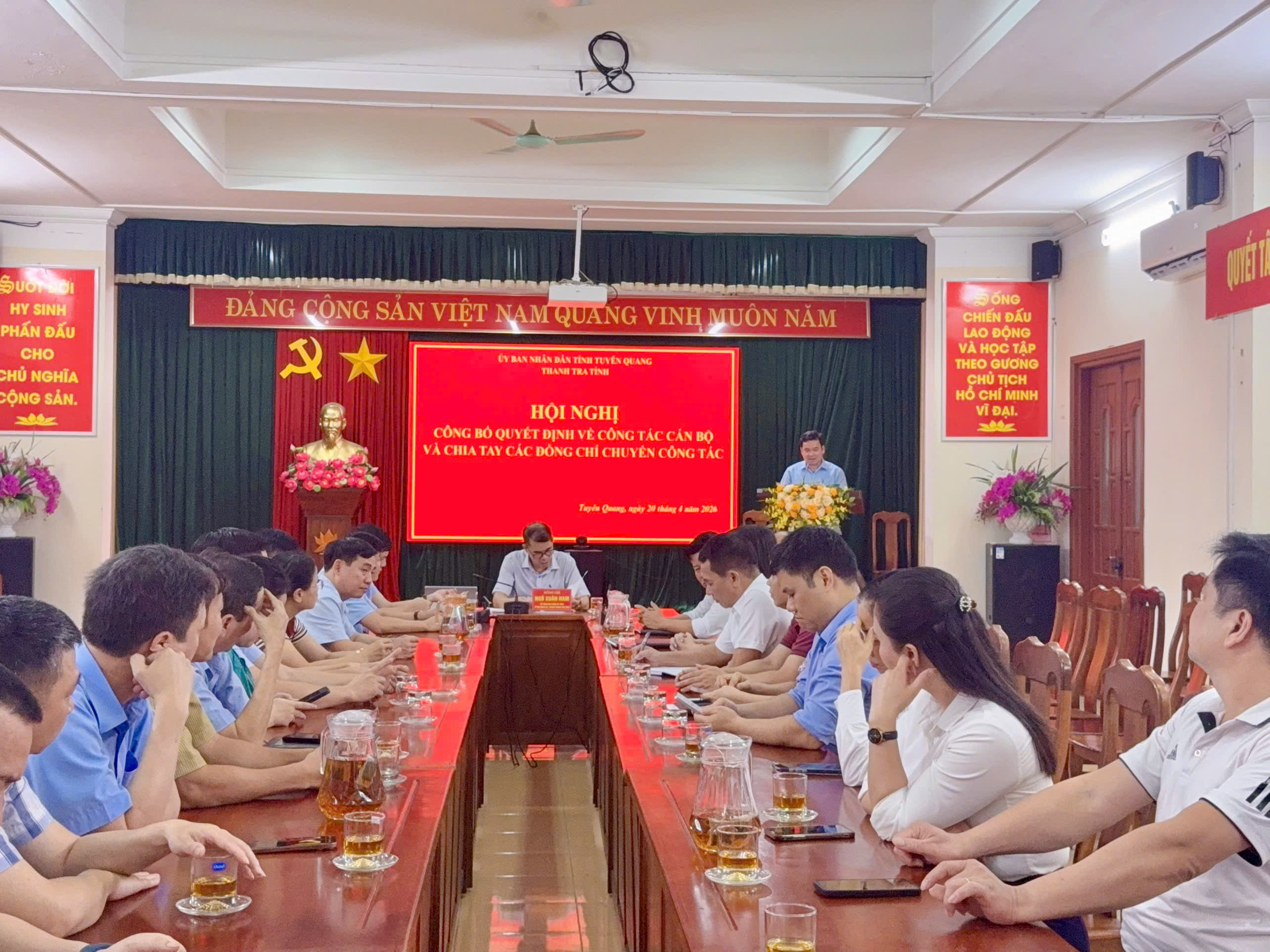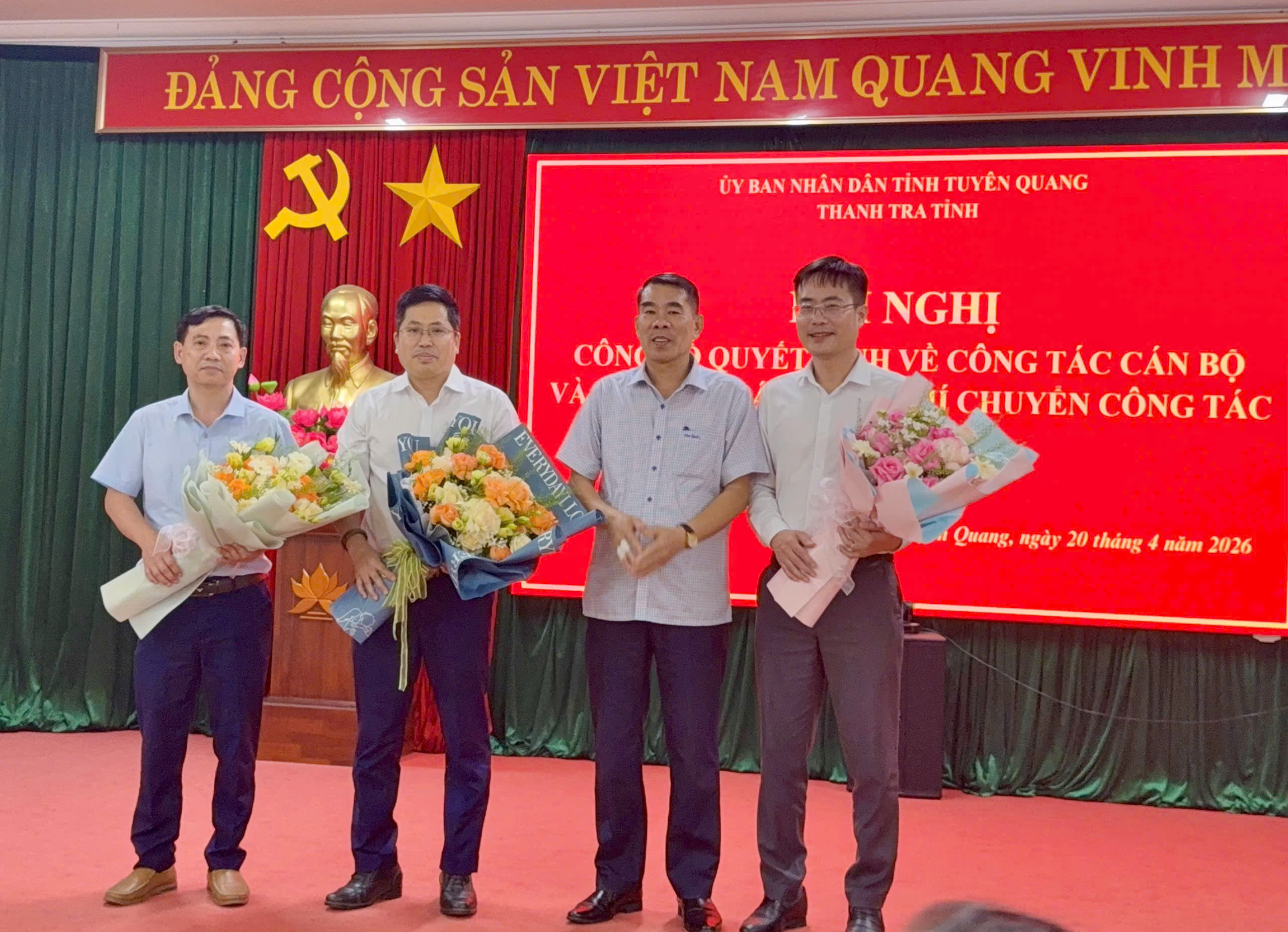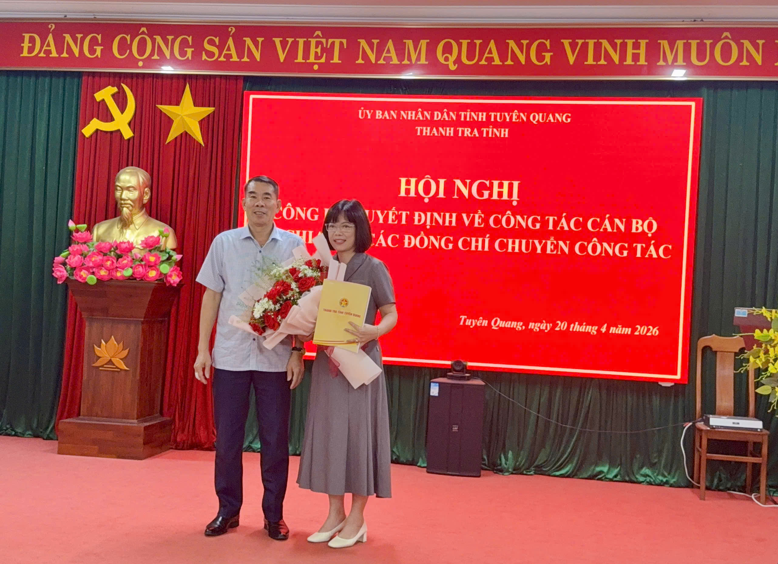 Thực hiện Quyết định số 112/QĐ-TTr ngày 16/4/2026 của Chánh Thanh tra tỉnh Tuyên Quang về việc bổ nhiệm cán bộ, Hội nghị đã công bố Quyết định bổ nhiệm đồng chí Trịnh Như Hoa giữ chức vụ Trưởng phòng Nghiệp vụ 6, Thanh tra tỉnh. Cùng với việc công bố quyết định bổ nhiệm, Thanh tra tỉnh cũng tổ chức chia tay 04 đồng chí được điều động, chuyển công tác về nhận nhiệm vụ mới.